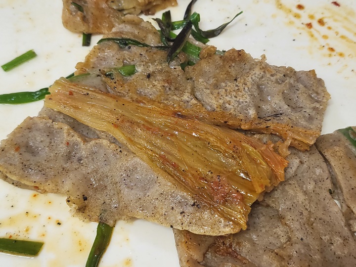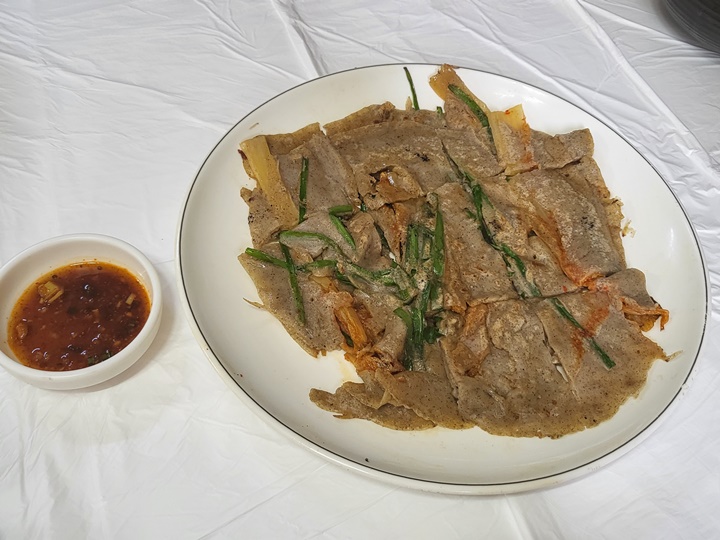 평소의 나였다면 조금 더 기다렸다가 모든 메뉴가 나온 다음에 떼샷을 찍고 나서야 먹기 시작했을 것이다. 하지만, 가족 모두가 몹시 배가 고팠던 상황이고 메밀전이 굉장히 맛있어 보여서 도저히 참을 수가 없었다. 결국 공이국수가 나오기 전에 메밀전은 게눈 감추듯 먹어치우고 만다. 김치가 약간 맵기 때문에 매운 거 못 먹는 아이는 김치 없는 부분만 먹었다.