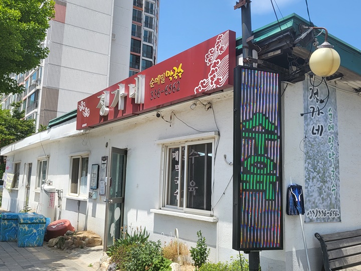 주말에 휘닉스 평창에 다녀왔다. 금방 도착할 줄 알고 아침을 안 먹고 출발했다. 저녁으로는 야외바베큐 포레스트 캠핑을 예약해 두었기에 아점은 간단히 먹기로 하고 들른 곳이 바로 평창 막국수 맛집으로 입소문 난 정가네 순메밀막국수이다. 아이와 함께 셋이서 반공이국수와 메밀부침 먹고 온 내돈내산 솔직후기이다.