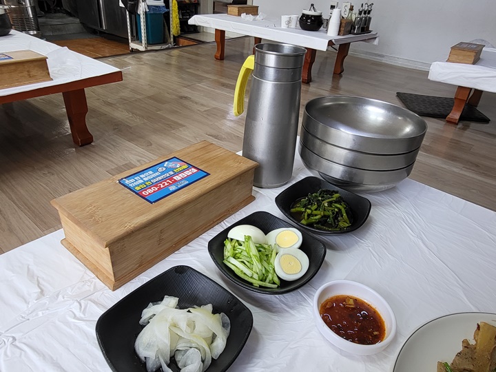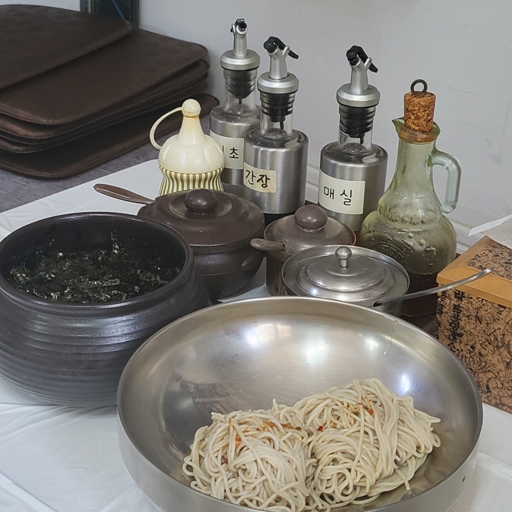 3인 가족이라 일단 두 덩이씩 사장님이 알려주신대로 조선간장에 들기름을 둘러 비벼먹었다. (반공이국수는 사리가 총 10개가 나오므로 2개씩 먹고 나니까 소쿠리에 남은 것은 단 4개. 이제 눈치게임 시작이다 ㅎㅎㅎ)