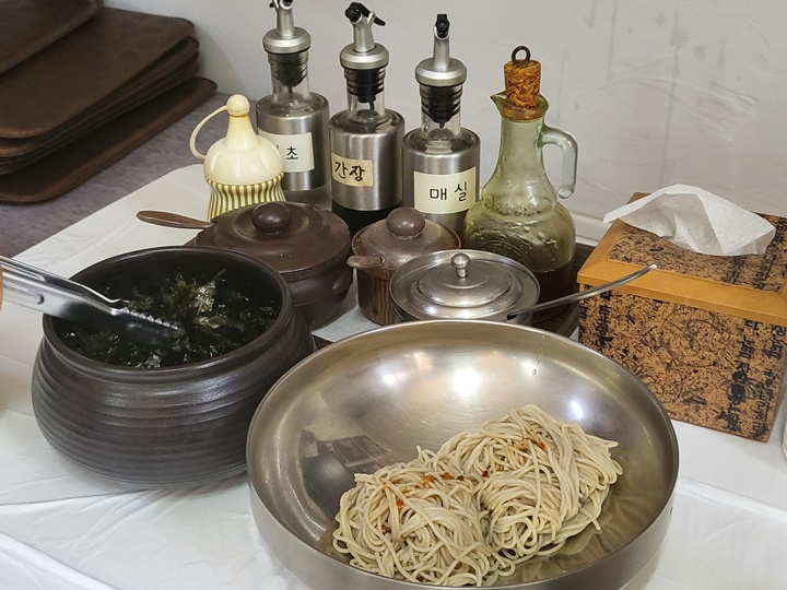 테이블마다 식초, 간장, 매실, 들기름 등등의 양념이 담긴 쟁반이 놓여있다. 막국수를 주문할 경우엔 그냥 비벼서 먹기만 하면 되지만, 공이국수를 주문할 경우엔 테이블에 놓인 양념으로 취향껏 간을 해서 먹어야 한다.