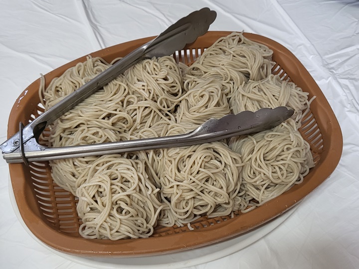 면을 미리 뽑아두지 않고, 주문이 들어오면 반죽 눌러서 면을 뽑아 소쿠리에 담아 나오는 시스템이라 자리에 앉아 주문했다고 해서 바로 음식이 나오는 것은 아니다. 자리는 우리가 앉은 테이블 말고도 안쪽으로 더 있는데, 신발을 벗고 들어가야 하는 좌식 테이블이다.