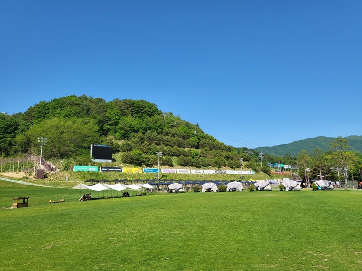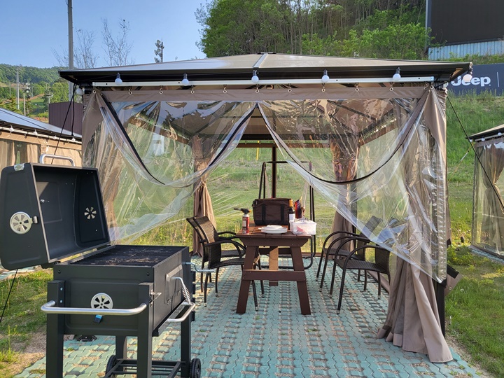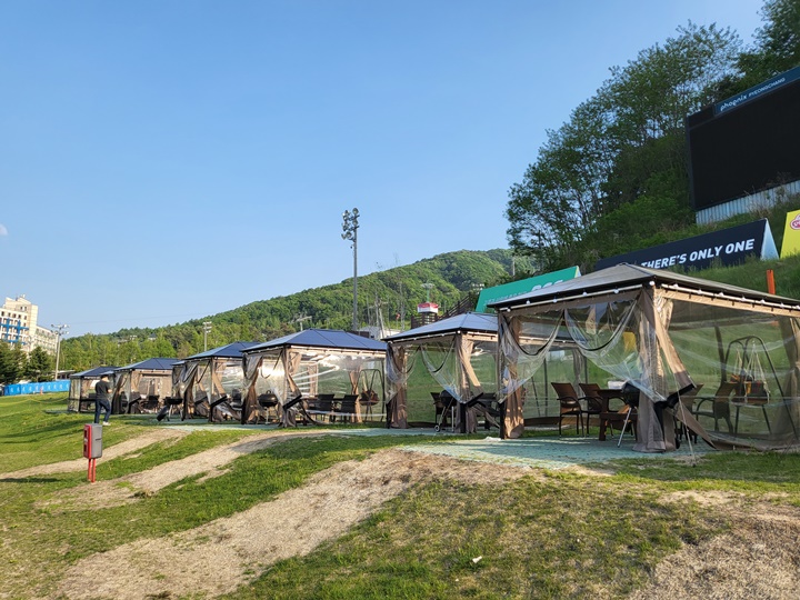 휘닉스파크 야외바베큐 이용시 원하는 자리를 선택할 수 있지만, 미리 선점한 이용자가 있다거나 지퍼가 닫힌 사이트는 정비 중이라 이용이 불가하다고 한다. 가장 이용하고 싶은 자리 두 곳이 정비중이라 그 옆자리를 이용하기로 했다.