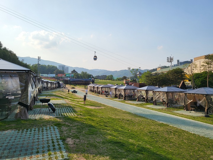 텐트는 총 35동인데 접수대에서 가장 멀리에 있으면서 짚라인 구경하기 좋은 자리에 앉고 싶어서 3층 왼쪽 끝자리에 앉고 싶었으나 3-1과 3-2는 정비중이라 3-3을 이용했다. 먹다 보니까 사실 뭐 구경은 잘 안 하게 된다. 굽고 먹는데 집중하느라 ㅎㅎㅎ