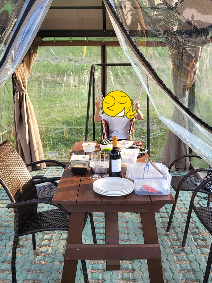 텐트 하나에 테이블과 의자 4개, 흔들의자도 있다. 아직 본격 모기가 많은 시즌은 아니지만 벌레에게 선호도가 높은 가족이라... ㅠㅠ 미리 모기퇴치제를 열심히 뿌렸음에도 꽤 물렸다. 우리 가족처럼 맛있는 피냄새를 풍기는 가족이라면 야외바베큐할 때 모기퇴치제 꼭 챙겨가시기를...