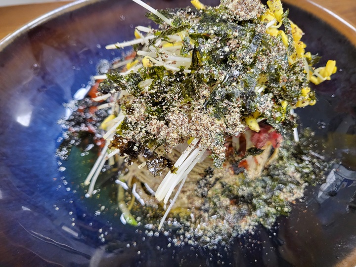 남편은 좀 비싼 거 같다면서도 육회비빔국수를 주문했다. 당연히 육회가 들어갔으니까 그냥 비빔국수에 비해서 더 비쌀 수밖에 없지. 국내산 대관령 한우육회가 들어갔다고 쓰여있구먼. 고소한 들깨가루, 쌉쌀한 메밀싹, 신선한 청정 대관령한우 육회 30g을 얹었다고 한다.