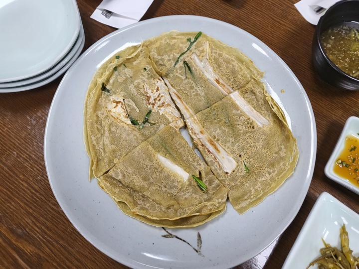 매운 김치를 넣어 부친 메밀전이 아니라서 아이도 부담 없이 먹기 좋았던 전, 메밀전병 선호도가 더 높아 보이지만 우리 가족은 메밀전을 더 좋아해서 이번에도 메밀전을 함께 주문했다. 막국수도 맛있지만, 메밀전도 수준급이다.