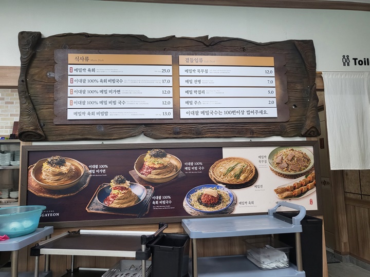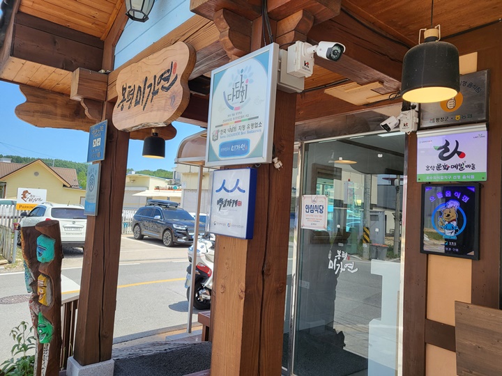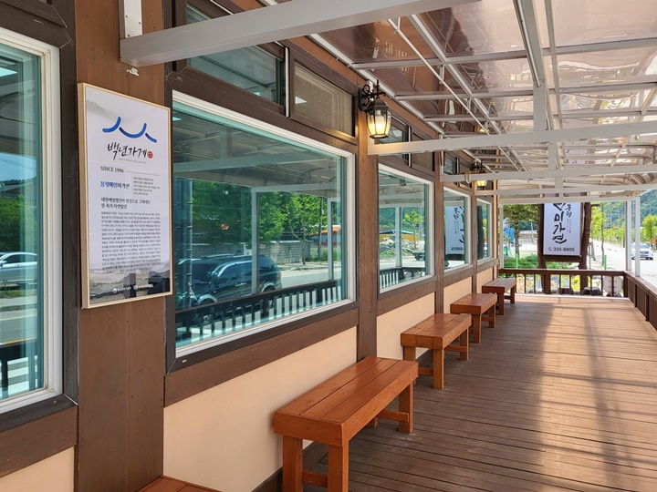 루지를 타고 곧장 봉평 미가연으로 향한 거라 점심을 먹기엔 약간 이른 시간이라 주차장은 한산했다. 식당은 새단장을 했는지 외관이 깔끔했는데 찾아보니 원래는 신발을 벗고 들어가는 좌식이었는데 바닥을 깔고 입식으로 바꾼 모양이다. 그러면서 외부 대기 공간도 보기 좋게 꾸며두었다.