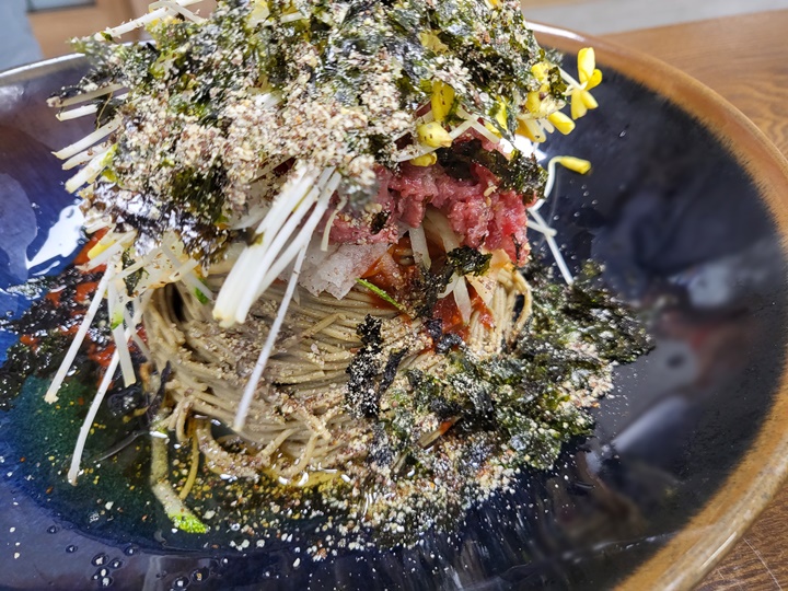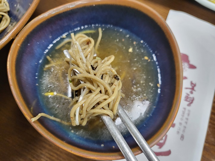 특히 함께 제공되는 육수에 소바처럼 메밀면을 담가 먹으면 훨씬 맛있게 먹을 수 있다. 아이가 먹기에도 이게 더 수월했다. 한 번에 다양한 버전의 국수를 즐길 수 있어서 입이 즐거웠던 메밀요리 맛집.