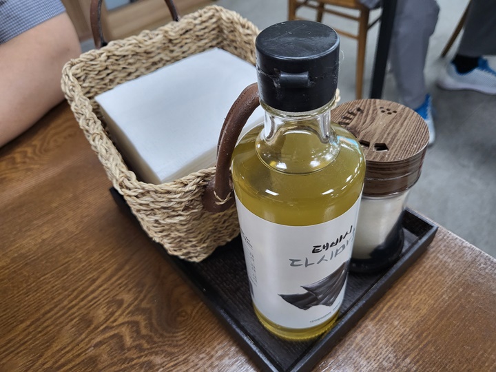 테이블에는 냅킨과 다시마 식초, 소금이 놓여 있고 수저통은 별도로 없다. 남편이 마음에 들어 한 점 중 하나는 수저통이 없고 수저집에 숟가락, 젓가락이 들어있는 안심식당이라는 것이었다.