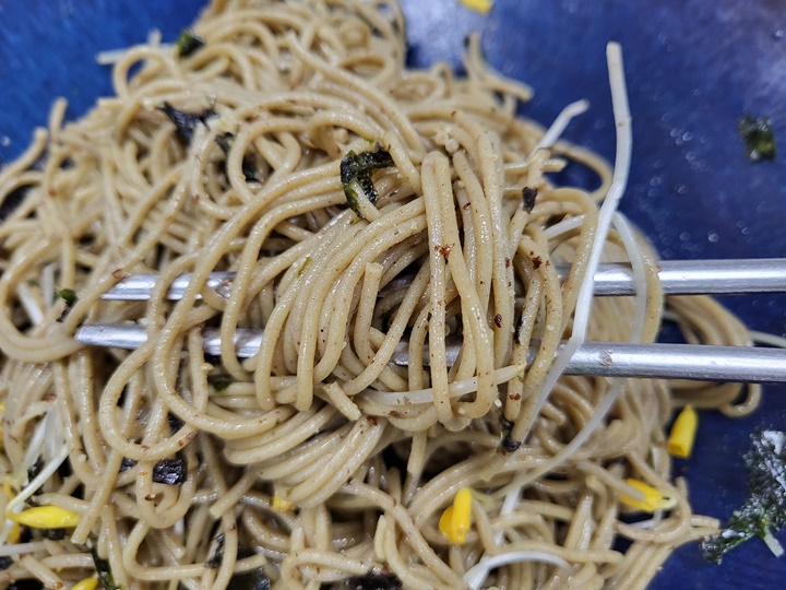 미가연의 대표 메뉴로 메뉴판에 이대팔 메밀국수는 100번 이상 씹어서 먹으라고 쓰여 있었다. 100번 씹어 먹지는 않았지만 평소보다 더 열심히 턱운동을 해서 씹어 먹었다. 100% 메밀면을 사용하는데 쓴 메밀과 단 메밀로 직접 순수 메밀면을 뽑아 사용한다고 한다.