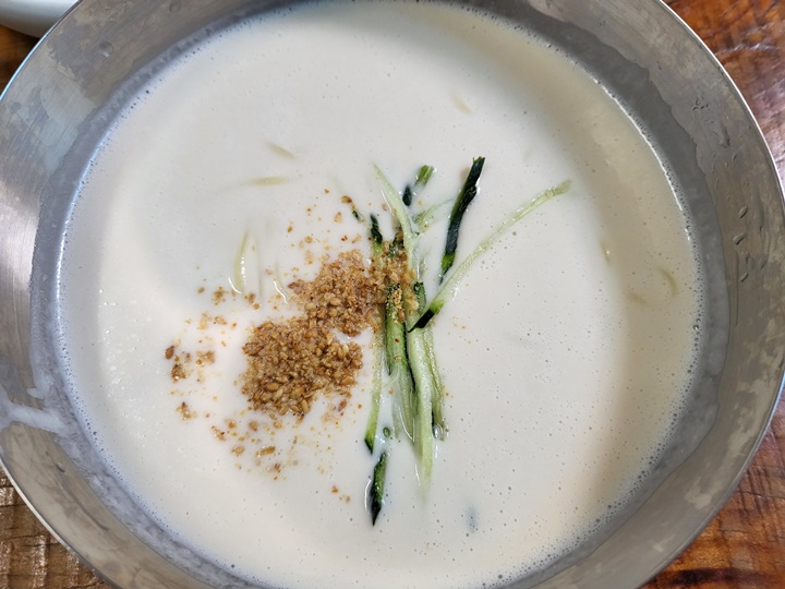 속껍질까지 벗긴 땅콩을 깨끗하게 여러 번 씻고 압력솥에 센 불에서 1시간 삶는다고 한다. 그 후 냉동고에서 하루 동안 식혀서 믹서에 갈아낸 땅콩 국물로 만드는 땅콩 콩국수는 특허까지 받은 음식이다. 특허받은 땅콩국수 맛이 궁금하다면 창원 북면온천으로 Go, go! 고소한 땅콩 콩국수, 땅콩두부 먹으러 산미 재방문한 내돈내산 솔직후기 끝:D