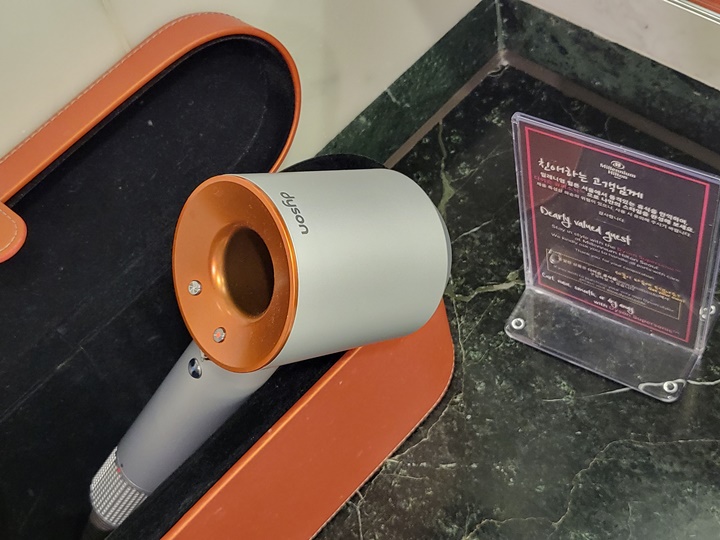 곱슬머리라서 다이슨 에어랩은 여행 필수템이다. 그런데 밀레니엄 힐튼 서울 객실에는 다이슨 슈퍼소닉™ 헤어드라이어가 비치되어 있다고 하길래, 글램팜 고데기만 챙겨 왔다. 다이슨 슈퍼소닉은 이번에 처음 사용해 보는데 바람이 진짜 강려크하다. 머리카락 금세 마른다며 남편이 매우 좋아함.