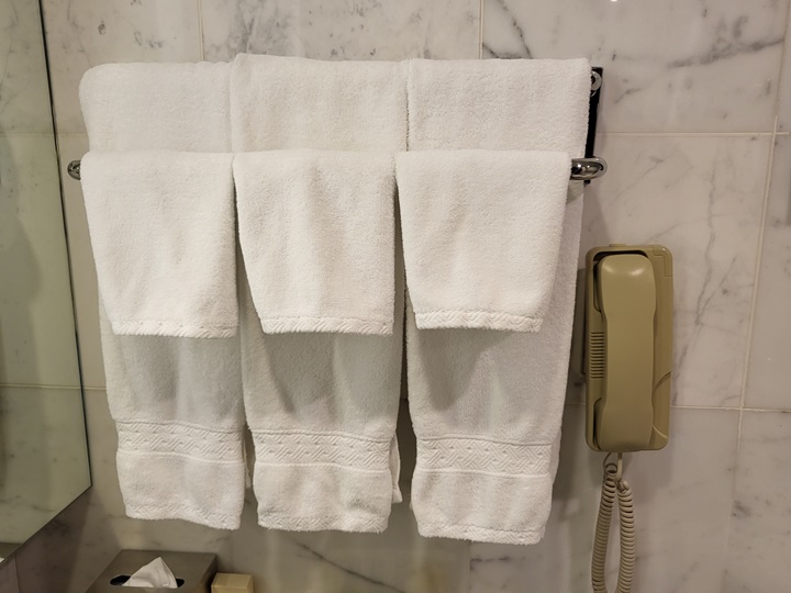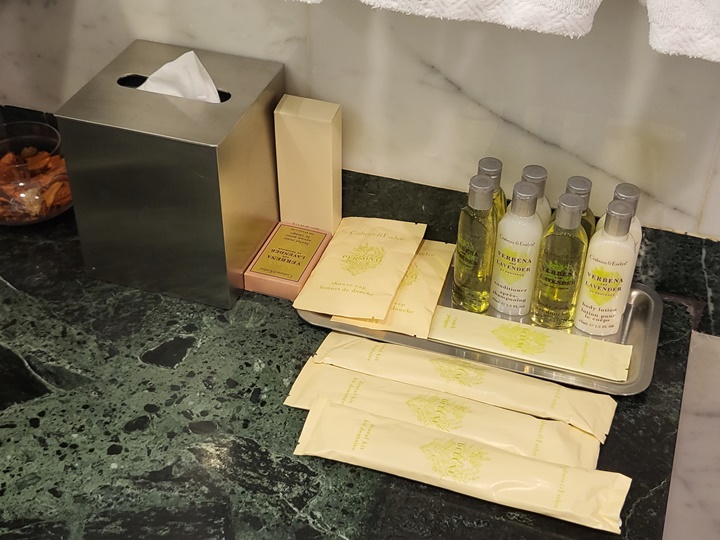 수건은 배스타월, 페이스타월, 핸드타월 모두 3장씩 정리되어 있었다. 덴탈 키트도 없을 것 같아서 챙겨 왔는데 일회용 칫솔 치약도 준비되어 있고, 일회용 면도기와 빗, 헤어캡도 준비되어 있다. 배스 어메니티는 크랩트리 앤 에블린 (Crabtree & Evelyn)으로 샴푸, 컨디셔너, 바디워시, 바디로션, 비누의 5종이 2세트 제공되어 있었다.