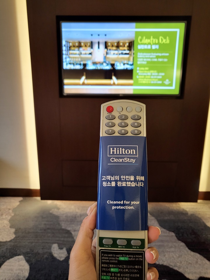 벽면에 42인치 LED TV가 설치되어 있다. 텔레비전 리모컨에도 객실 출입문에 붙어있던 스티커처럼 청소를 완료했다는 Clean Stay 스티커가 부착되어 있다.