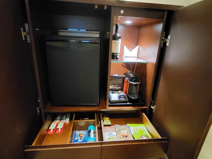 무료 미니바 책상 뒤쪽에는 미니바가 있다. 냉장고장이 오래되어서 그런지 아귀가 딱 맞지 않는? 여튼 이 안에 있는 거 무료 생수(파랑 뚜껑, 무료생수 표시된 것)와 캡슐커피만 무료이고 다 유료 제공이다. 무료 생수는 하루 2병, 캡슐커피는 하루 4알이라고 하는데, 3인 투숙이라 그런지 냉장고 안에 3병, 텔레비전 옆에 3병이 놓여 있었다.