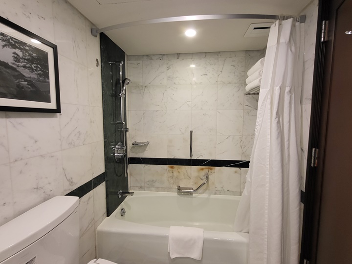 밀레니엄 힐튼 서울 프리미엄 디럭스 룸 욕실은 세면대, 변기, 욕조까지 갖추고 있다. 욕실 전화기 등 집기가 오래되었는데 관리는 연식 대비 굉장히 잘 되고 있다는 느낌을 받았다.