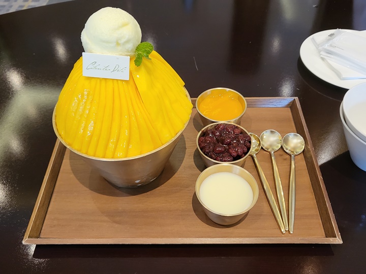 미리 예약도 했고, 예약된 시간에 맞춰 내려 갔는데... 직원분께서 빙수 주문이 밀려서 조금 기다려 달라고 하셨다. 20분 기다린 후에 망고 빙수가 나왔는데 왜 20분이나 걸렸는지는 잘 모르겠다. 오전에 예약 없이 방문해서 먹은 애플 망고 빙수는 거의 5분 만에 나왔는데???