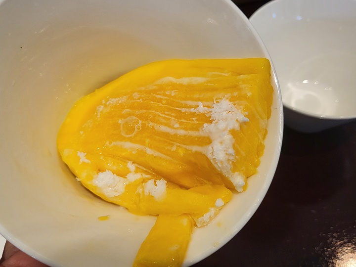 망고빙수 위에 뚜껑처럼 씌워진 망고는 한장씩 슬라이스 해서 펼쳐놓은 게 아니라 윗부분은 붙어있고 아랫부분만 칼집을 넣어서 펼쳐놓은 거였다.