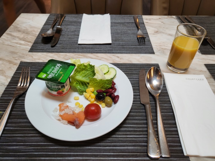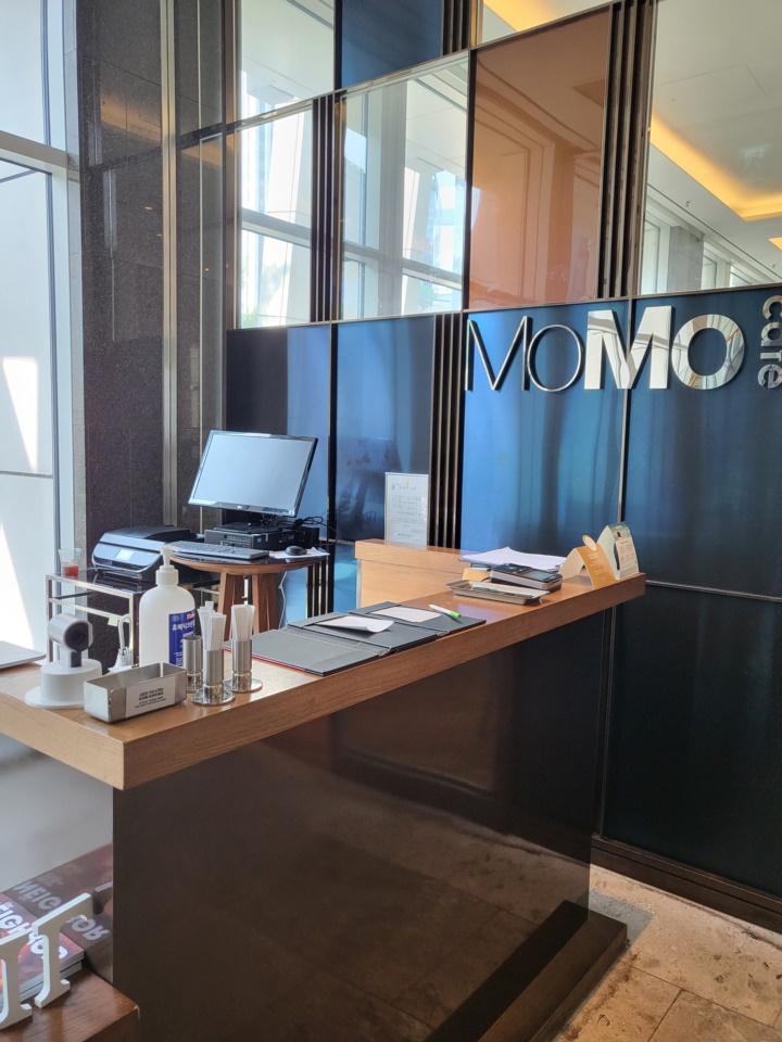 코트야드 바이 메리어트 서울 남대문 조식 뷔페 조식은 2층 모모카페에서 오전 6시 30분부터 10시까지이다. 체크인할 때 보니까 7시 30분부터 9시 30분까지는 매우 혼잡한 시간대라는데.. 보통 사람인 우리는 평범하게 일어나 식사를 하기로 했기에 매우 혼잡한 시간대에 먹게 되었다. 이미 만석이라 대기를 해야 했는데, 모모카페 말고 라운지에서 먹어도 괜찮냐고 물어보셨는데 상관없어서 우리 가족은 라운지 쪽에서 조식을 먹었다.