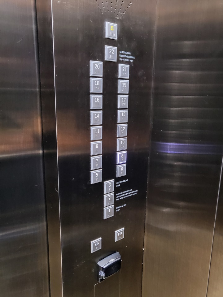 그리고 객실층 올라가는 엘리베이터는 객실 키 터치해야 층수 버튼을 누를 수 있다.