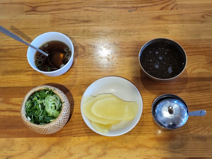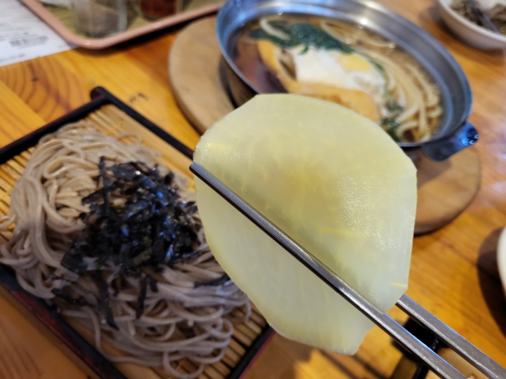 주문하고 잠깐 화장실 다녀온 사이에 세팅된 테이블. 숟가락 담가진 육수는 비빔메밀면에 같이 나오는 온육수이고, 오른쪽육수가 판모밀 간장 육수이다. 파랑 겨자 통은 평범해 보이는데 단무지는 평범해 보이지 않는다. 이 단무지가 참 맛있다!