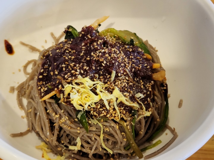 메밀면에 매콤한 양념, 달걀지단, 깨소금 등을 넣어 비벼 먹는 비빔메밀. 맛집에 가면 비빔냉면 비빔국수는 남편 담당이라서 비빔메밀도 남편이 먹었는데 그냥 평범한 맛이라고 한다...