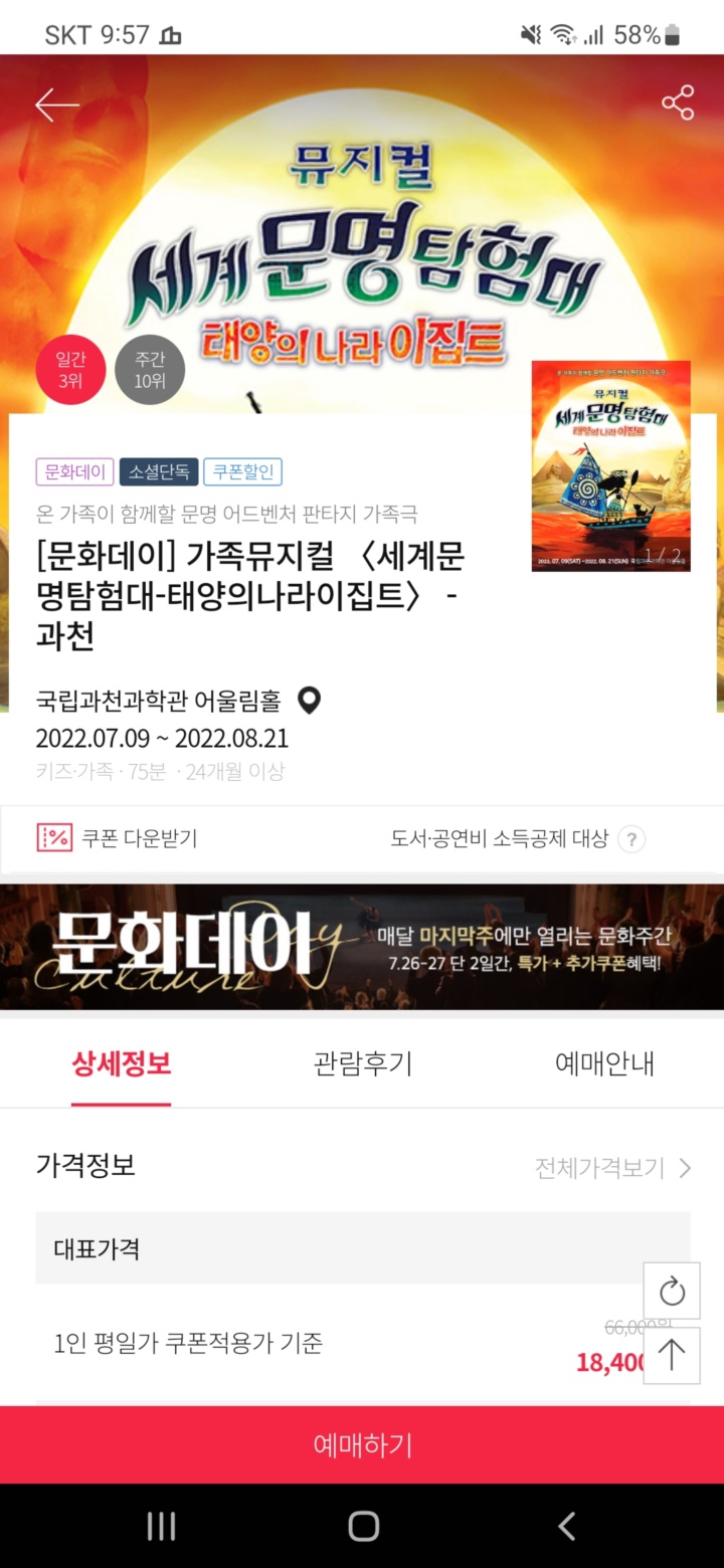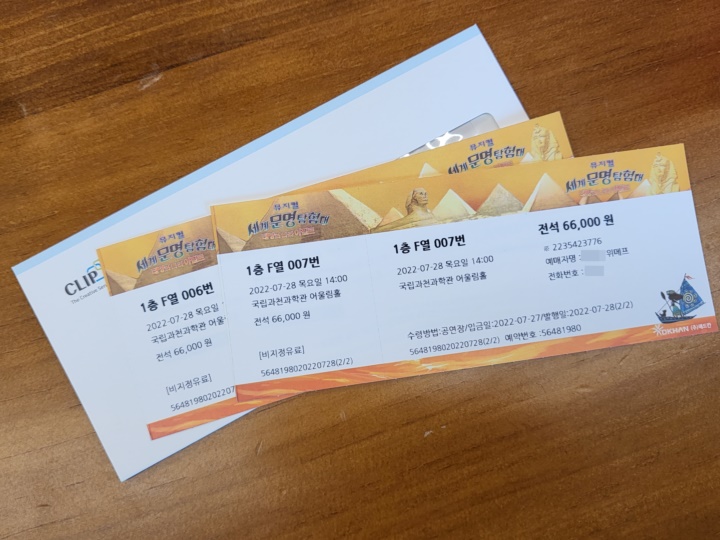 뮤지컬 세계문명탐험대 태양의 나라 이집트는 전석 66,000원. 하지만 인터넷으로 예매하면 대부분 반값 이하로 예약할 수 있었다. 마침 위메프에서 문화주간 행사로 특가 19,900원에 추가 쿠폰 혜택까지 있어서 1인당 17,650원에 예매했다. 미리 예매하지 않아도 현장 예매로 45% 가량 할인하여 구매하는 방법도 있다. (일찍 도착해서 티켓을 수령하고 이마트24 근처 벤치에서 음료수 마시며 더위를 식히고 있는데 현장예매 할인권을 나눠주는 분이 계셔서 알게 됨)