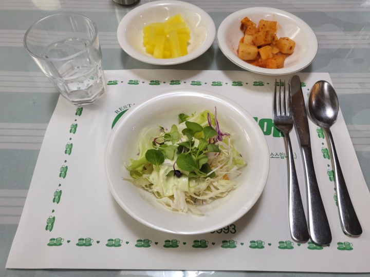 반찬으로는 옛날 경양식집 그대로 단무지와 깍두기, 스프는 오징어덮밥 주문해도 제공되어서 3그릇이 나왔는데 양배추 샐러드는 2그릇만 나왔다. 특이점은 옛날 경양식집 샐러드는 보통 케요네즈 양배추 샐러드인데 마로니에의 샐러드는 상큼 달콤한 드레싱을 사용했다.