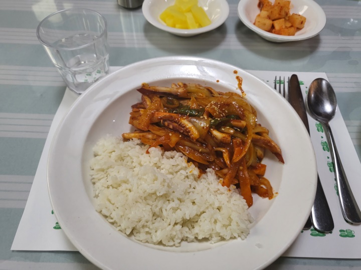 김치볶음밥 주문할까 오징어덮밥 주문할까 고민하다가 직원분께 오덮도 맛있냐고 물어보고 주문했는데... 보기엔 먹음직스러워 보였는데, 양념이 아주 맛있지는 않고 그냥 평범한 맛(이라고 남편은 말했다.)