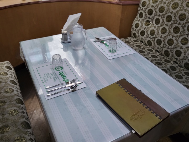 친절한 직원분께 안내받은 자리는 푹신한 등받이 소파 자리였다. 이쑤시개 통이며 냅킨, 테이블 세팅지도 옛 감성 그대로이다.