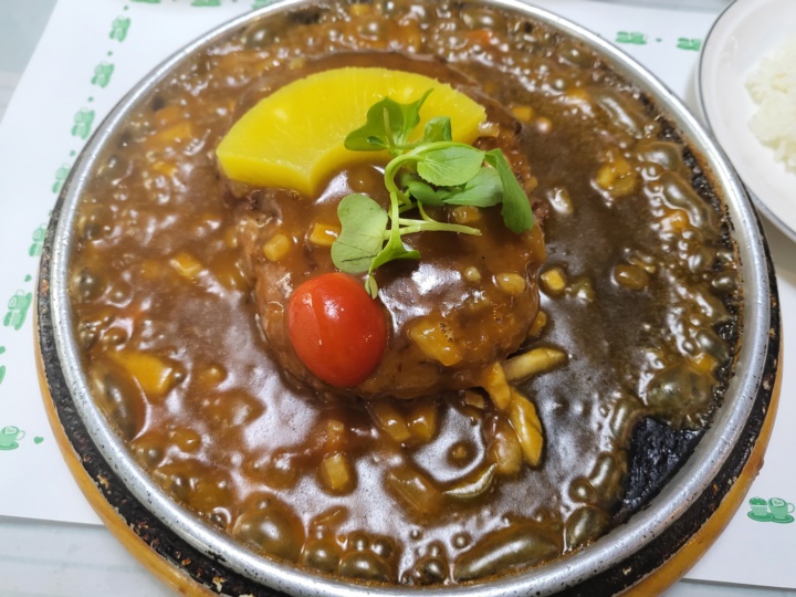 마로니에 함박 스테이크는 상당히 두툼하다. 그래서 뜨거운 철판에 나오는 것 같은데 아이가 먹기엔 상당히 뜨거워서 식혀서 잘라서 밥 플레이트에 올려놓고 식혀 먹어야... 함박 반죽은 부드럽고 두툼하고 사진 찍으면 맛있어 보이는 비주얼이다. 개인적으로 소스는 맛있지만, 스테이크 반죽은 배합이 내 취향에 부합하지는 않았다. 그래도 남김없이 다 먹었지만 :)