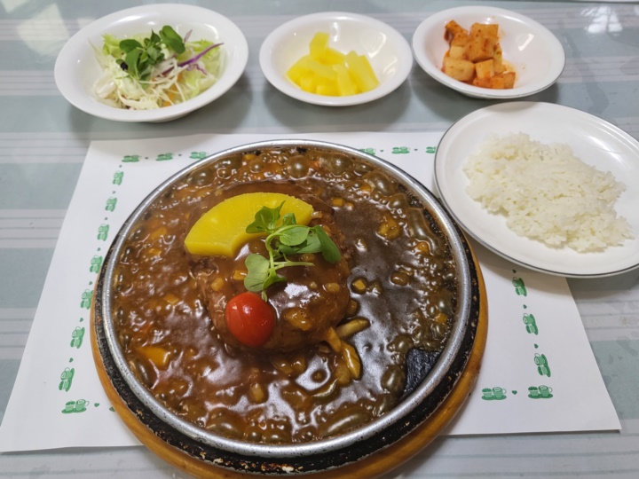 안성 마로니에의 함박스테이크는 비주얼이 남다르다. 뜨거운 철판에 나와서 소스가 지글지글 끓고, 온기가 다 먹을 때까지 유지되어서 좋다.
