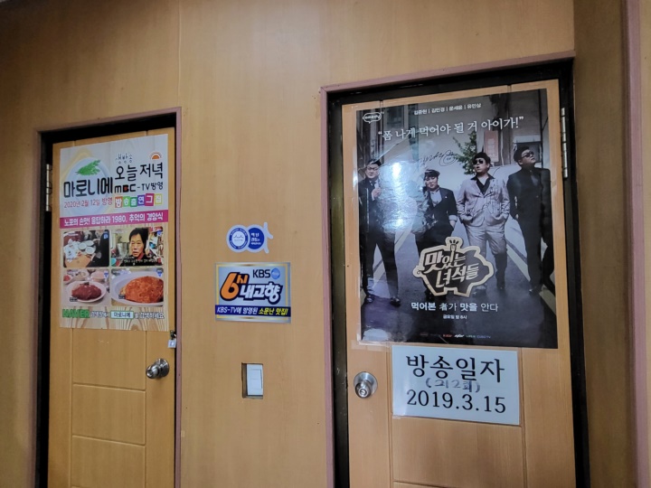 팥빙수, 생과일쥬스 글씨체와 색 조합 무엇? 옛날 감성 돋는다 ㅎㅎㅎ 건물 2층에 있어서 계단으로 올라갔는데 맛있는 녀석들, 6시 내고향 등 소개되었던 방송 포스터도 붙어있다.