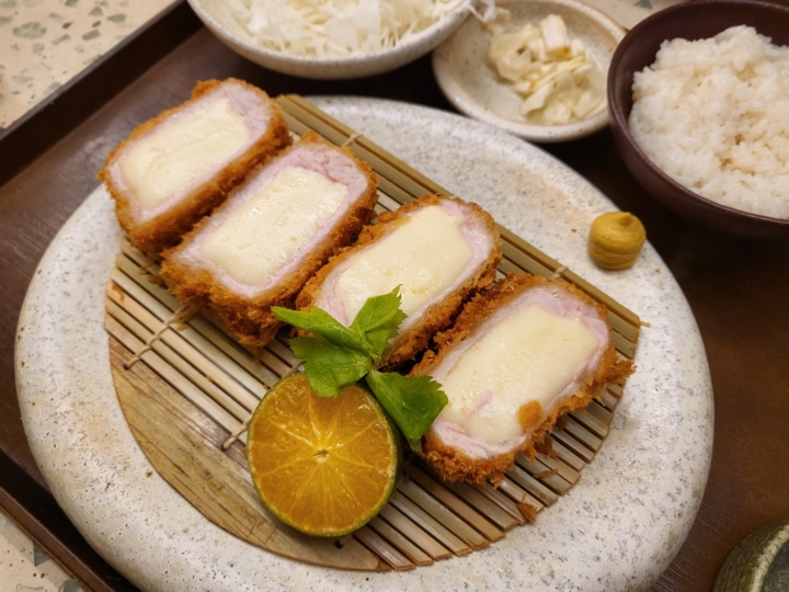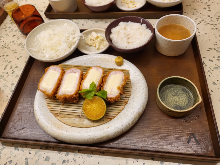 치츠카츠, 양배추 샐러드(소스는 테이블에 있는 거 사용하면 됨), 장국, 밥, 백김치와 함께 나온 치즈카츠 4점 겨자, 라임과 함께 정갈한 담음새. 치즈카츠는 생 모짜렐라 치즈를 듬뿍 사용해 비주얼이 아주 먹음직스럽다.