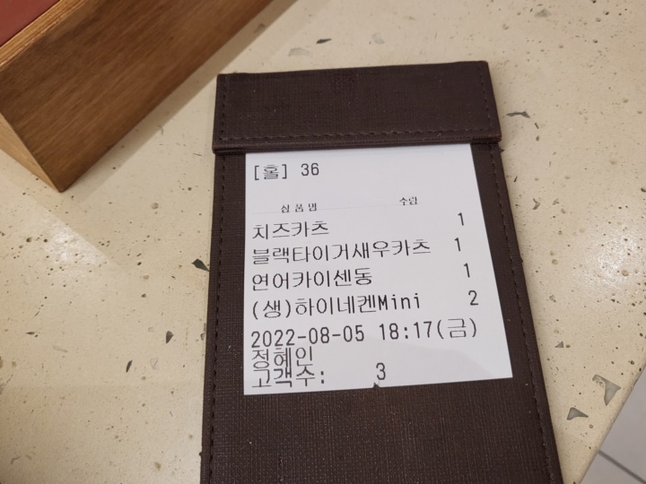 가장 먹고 싶었던 후토마끼는 솔드아웃이라 주문하지 못했고, 대신 연어 카이센동을 주문했다. 치돈의 매력에 빠진 아이는 치즈카츠, 새우를 매우 좋아하는 남편은 블랙타이거새우카츠를 주문했다. 맥주는 미니 사이즈가 있어서 하이네켄 생맥주 미니로 주문!