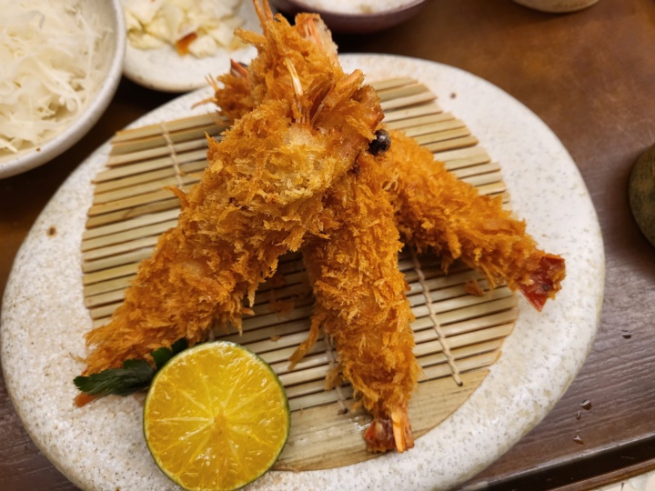 양배추 샐러드와 밥, 장국, 백김치가 나오는 것은 치즈카츠와 동일한데 새우카츠에는 수제 타르타르 소스가 함께 나온다. 설명에는 '진한 풍미와 새우 살이 꽉 찬 명품 블랙타이거'라고 했으나 새우를 아주 즐겨먹는 남편의 말로는 새우가 퍽퍽하고
