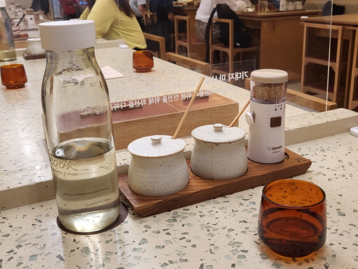 테이블마다 소스와 깨 자동 분쇄기, 물 등이 가지런히 준비되어 있다. 소품 하나하나 신경 써서 갖춘 느낌인데 특히 물컵이 아주 마음에 든다.