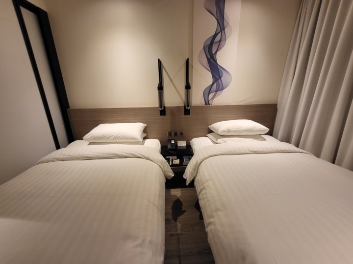 트윈 침대, 침대 크기가 동일한 줄 알았는데 왼쪽 침대가 조금 더 크다. 아마 슈퍼싱글과 싱글 베드로 준비되어 있는 것 같다.
