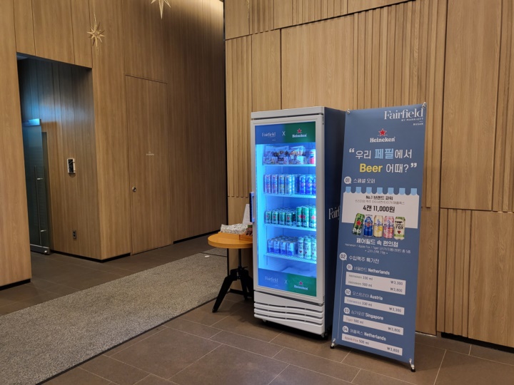 1층 리셉션에서 체크인하는 동안 찍은 사진, 밤 9시쯤 도착하니 로비에 아무도 없고 체크인하는 시간도 얼마 걸리지 않았다. 1층에서 캔맥주와 프링글스 등 간단한 스낵류도 염가에 판매 중이다. 구매를 원할 경우 프론트 데스크에 문의하면 된다.