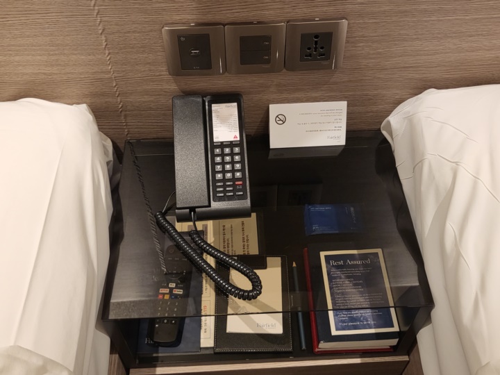 침대와 침대 사이 협탁에는 전화기, 리모컨 등이 놓여 있고 콘센트가 있어서 스마트 기기 충전하면서 폰 보다가 스르륵 잠들 수 있는 구조이다.