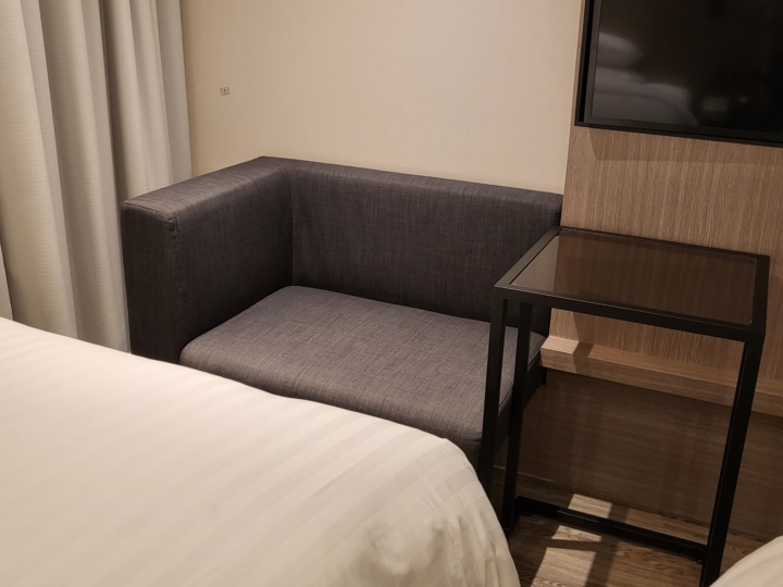 침대 아래쪽으로는 작은 소파와 탁자가 놓여 있는데, 소파랑 창문 쪽 사이를 잘 살펴보면 여기에도 콘센트가 있어서 여기에서도 충전 가능하다. 덕분에 작은 객실이지만 각자 영역을 나눠서 쉴 수 있었다.