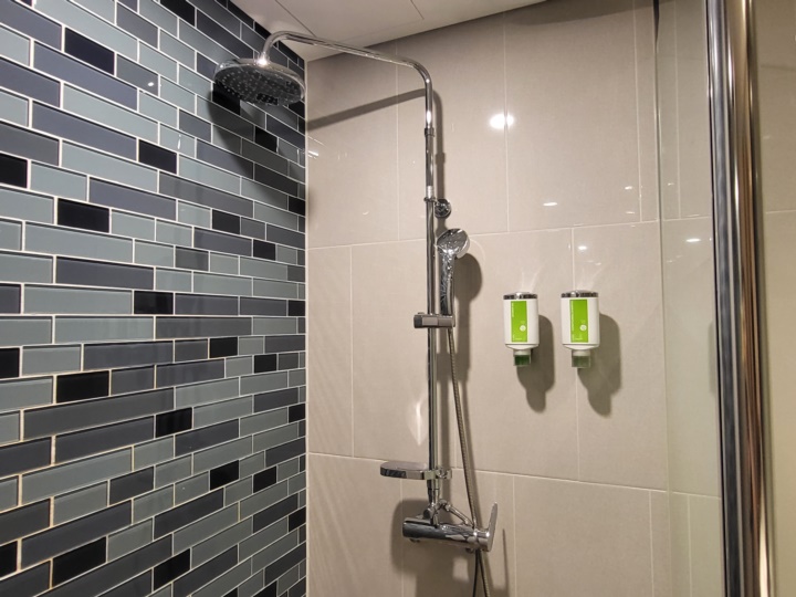 샤워 칸과 변기 칸은 문 하나로 번갈아 닫게 된 구조라서 한 칸을 점유하고 있을 때 다른 칸은 문이 열린 상태로 사용해야 하는 거다. 어메니티는 예전에는 일회용으로 준비되어 있었는데, 이제는 벽면에 부착되어 있는 다회용이다.
