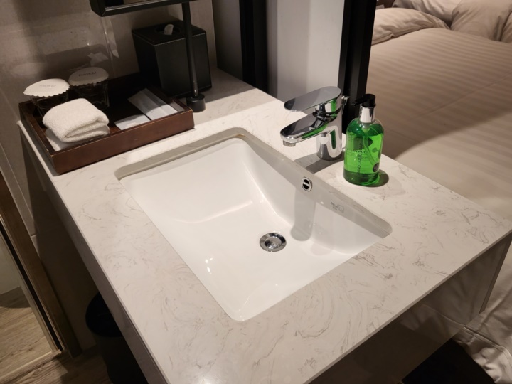세면대에는 핸드워시가 준비되어 있고, 핸드타월과 덴탈키트도 준비되어 있다. 세면대 아래로는 페이스 타월과 배스타월, 드라이어가 있고 매일 타월도 교해준다.