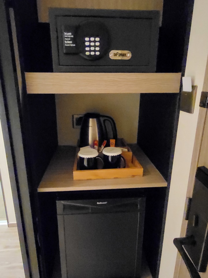 문 들어서자 마자 오른쪽으로는 미니 냉장고와 금고, 전기포트 등이 준비되어 있다. 생수는 2병 들어있는데 매일 새로 리필된다.