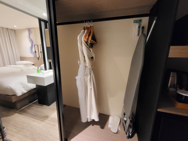 옷장이 미닫이로 구획이 되어 있어서 공간활용이 잘 되어 있다. 좁은데 활용도가 아주 짱임. 샤워가운과 다리미, 다리미판도 준비되어 있고 일회용 실내화도 있다. 페이필드 부산 해운대 호텔의 유일한 단점(?)이 바로 이 부직포 슬리퍼이다. 1박만 할 거면 큰 상관없는데 2박 이상이라면 다른 실내화 챙겨 오는 게 좋을 듯. 정말 잘 빵꾸난다 ㅋㅋㅋ 착용감도 '종이 신발' 신고 있는 거 같은 느낌;;;;