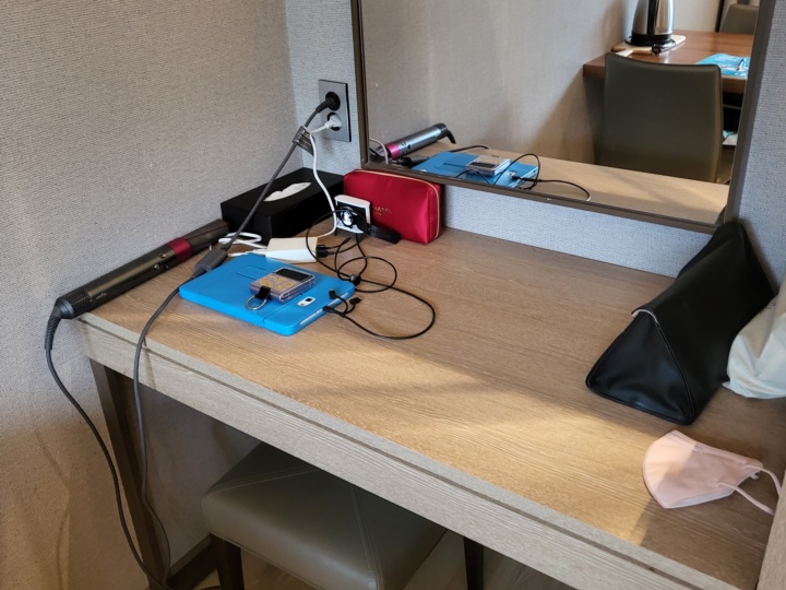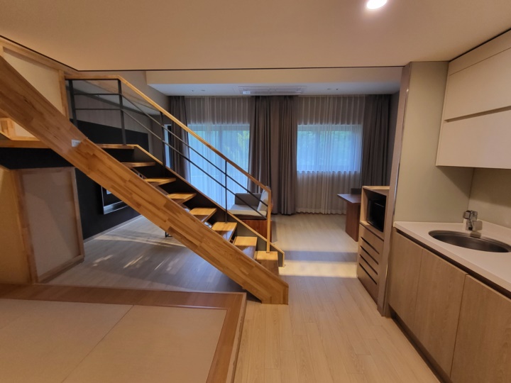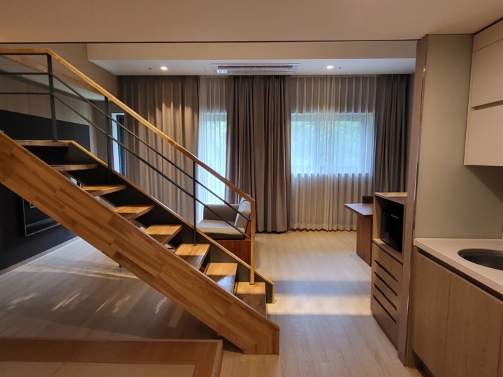 냉장고 뒤쪽으로 화장대가 있고, 그 앞으로 4인용 식탁도 있다. 가족단위로 여행하면서 큰 불편함 없이 지낼 수 있는 객실이었다. 특히 아이가 있는 가족에 추천하는데 복층 계단은 위험할 수 있으니 (난간이 한쪽은 없음) 요주의!
