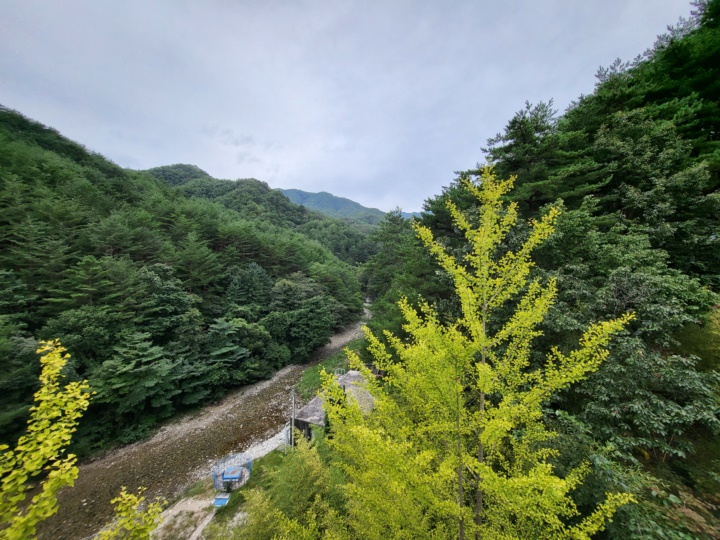 커튼을 걷으면 발코니가 나온다. 멀리로 보면 산책로가 보이는데 현재는 산불로 인해서 손실된 구간이 많아서 위험하다. 자연 용출되는 국내 유일의 덕구온천 원탕이 보고 싶어서 왕복 2시간 아이와 함께 다녀왔는데 길이 복구되기 전까지 아이와 함께 다녀오는 것은 위험할 것 같다. 자세한 포스팅은 추후 자세히 해보려고 한다. 여튼 산불 미움!!!