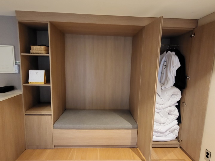 복층에서 내려오면 1층은 다다미처럼 생겼다. 여기에서 이불 깔고 자도 편했다. 옷장에는 침구와 목욕가운 (성인용 2), 아동용 판초타월 2가 준비되어 있었다.