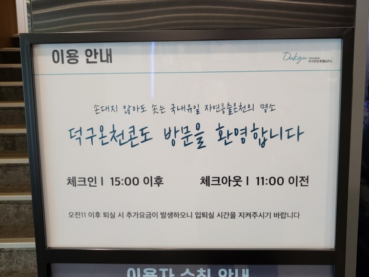 덕구온천 콘도 1층 프론트 체크인 15:00 이후, 체크아웃 11:00 이전 까지. 오전 11시 이후 퇴실 시 추가 요금이 발생하오니 입퇴실 시간을 지켜야 하고 쓰레기는 분리배출해서 직접 내어놓아야 한다.