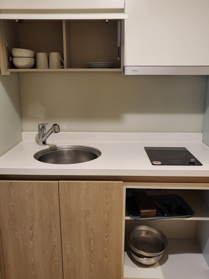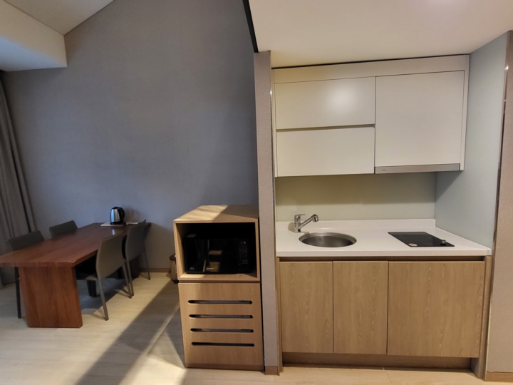 객실 내 취사는 불가하지만 전자레인지와 미니 냉장고, 전기레인지, 싱크대와 간단한 식기류가 마련되어 있다. 유아 이유식 데워 먹이거나 간단한 간식 먹기에는 좋은 구성이다. (호텔동 객실내에는 전자레인지 없음)